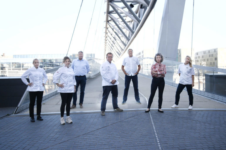 Foto: Det Norske Måltid/Kristin Austigard. Et av tre dommerpanel i årets delfinaler: Fra venstre Tonje Torvanger (Statholdergaarden), Eline Gulbrandsen (Det Kongelige Hoff), Einar Risvik (Nofima), Jørn Lie (Vaaghals, Gamle Raadhus – og Code restaurant), Gunnar Bakke (Daglig leder BKLF), Maj-Britt Aagaard (spiselandslaget.com), Tonje Holtungen (Sjokolade Salongen)