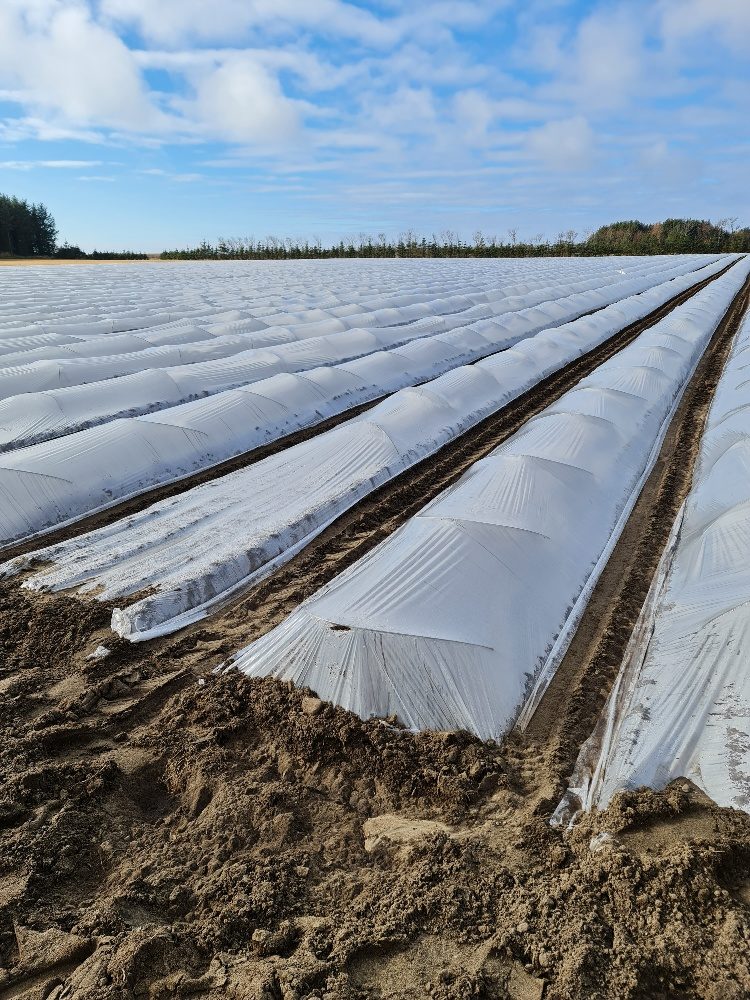 Det blir deretter lagt på fiberduk, men denne kan brukes i 7-8 år. Høsting starter rundt andre uke i juli.