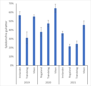 Figur 2: Gjennomsnittlig andel sykdomsfrie gulrøtter for regionene Innlandet, Rogaland, Trøndelag og Viken registrert ved lageruttak i 2019 – 2021.