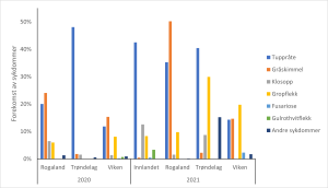 Figur 3: Gjennomsnittlig forekomst av gulrotsykdommer for regionene Innlandet, Rogaland, Trøndelag og Viken i 2020 og 2021.