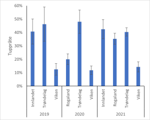 Figur 4: Gjennomsnittlig andel tuppråte for Innlandet, Rogaland, Trøndelag og Viken registrert ved lageruttak i 2019 – 2021.