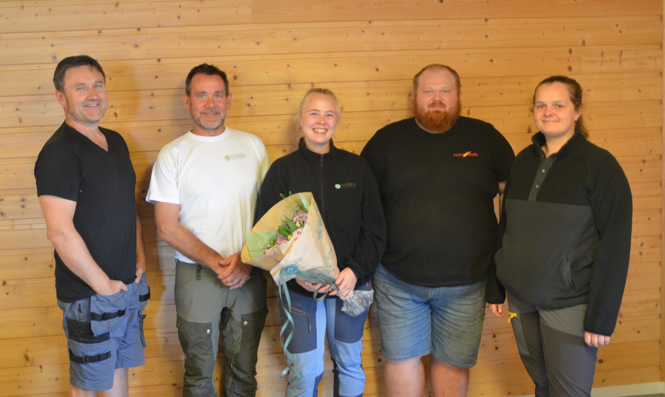Bildet: Oda Torgersbråten mottok gratulasjoner og blomster fra (f. v.) Magne Bergerud og Kristian Guren i de godkjente lærebedriftene, og Finn-Erling Kristoffersen og Anne Eline Nærstad, som godkjente fagprøven på vegne av fagprøvenemda.