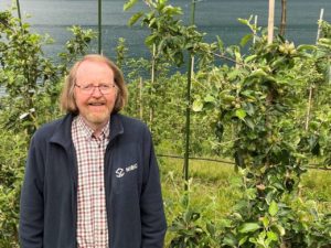 Seniorforskar innan frukt, Mekjell Meland, ved NIBIO Ullensvang på Lofthus. Ved klonarkivet her har dei 175 av dei 424 historiske eplesortane i samlinga si. Foto: Darius Kviklys