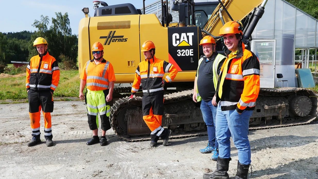 Bildetekst: Hernes AS tok initiativ til samarbeidet, som er kortreist og gir ekstra miljøgevinst. Lærling Osker Olsen (fra venstre), Jon rune Stokke, bas Ole Magnus Bjørnås, anleggsleder Lars Inge Hoås og driftsleder Eivind Svarva i Hernes AS. Foto: Runar Vollan